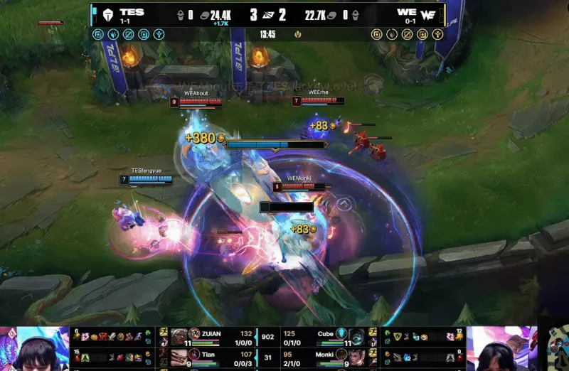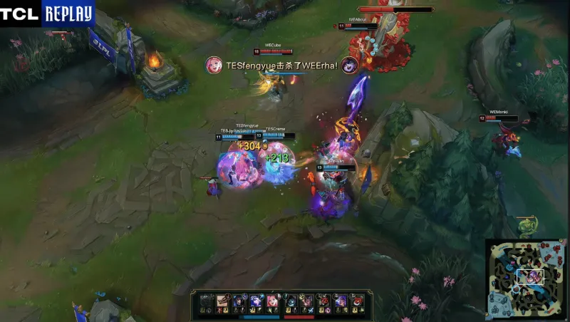 19分钟,TES中路抓住机会击杀掉WE下路双人组